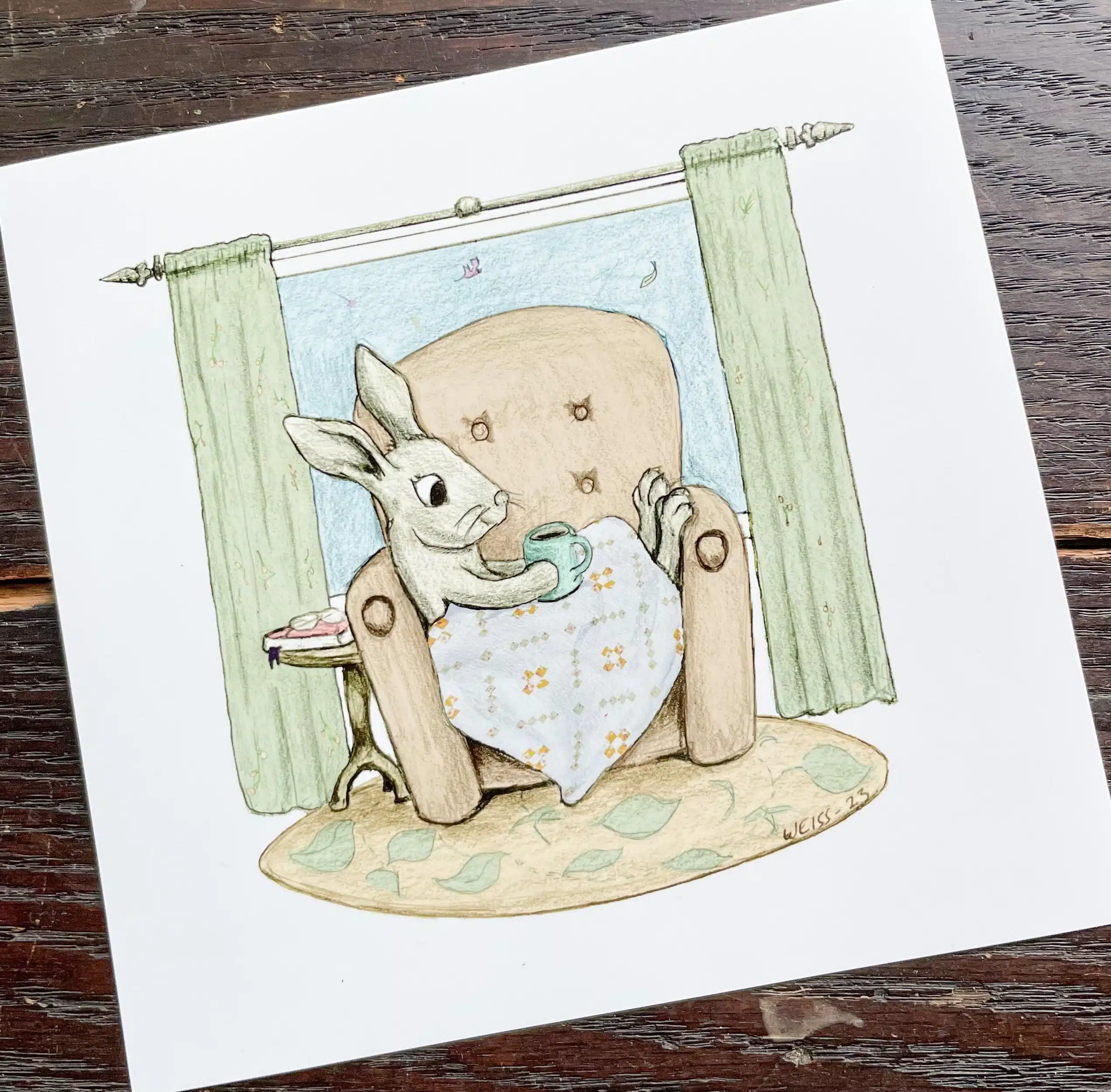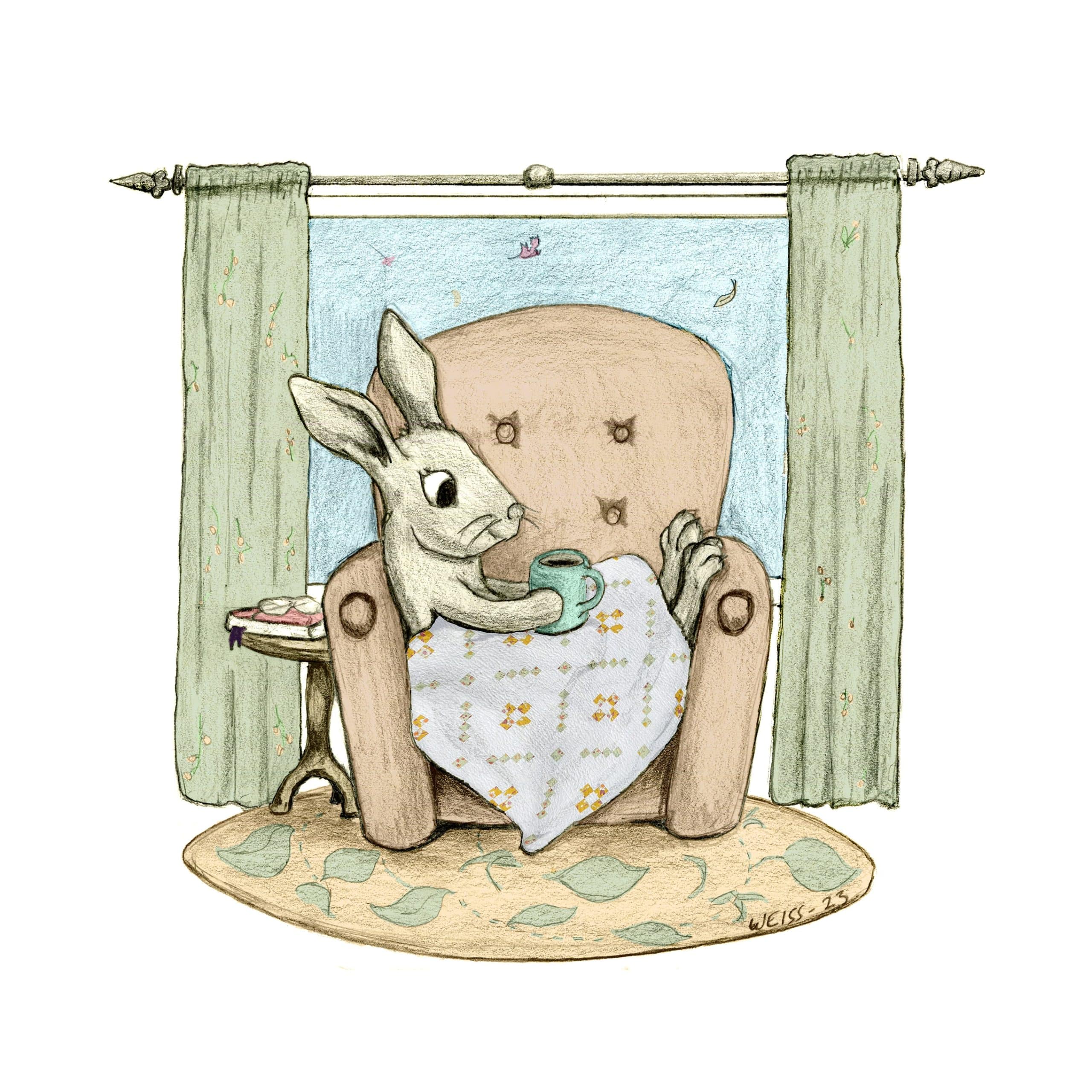 The Cozy Quilt Bunny digital download is an original design dreamed up by Kristin of Heart Lake Quilts and drawn by her husband Dan of Edelweiss Illustration. The quilt in the bunny’s lap is Kristin’s design and pattern, Still Connected.