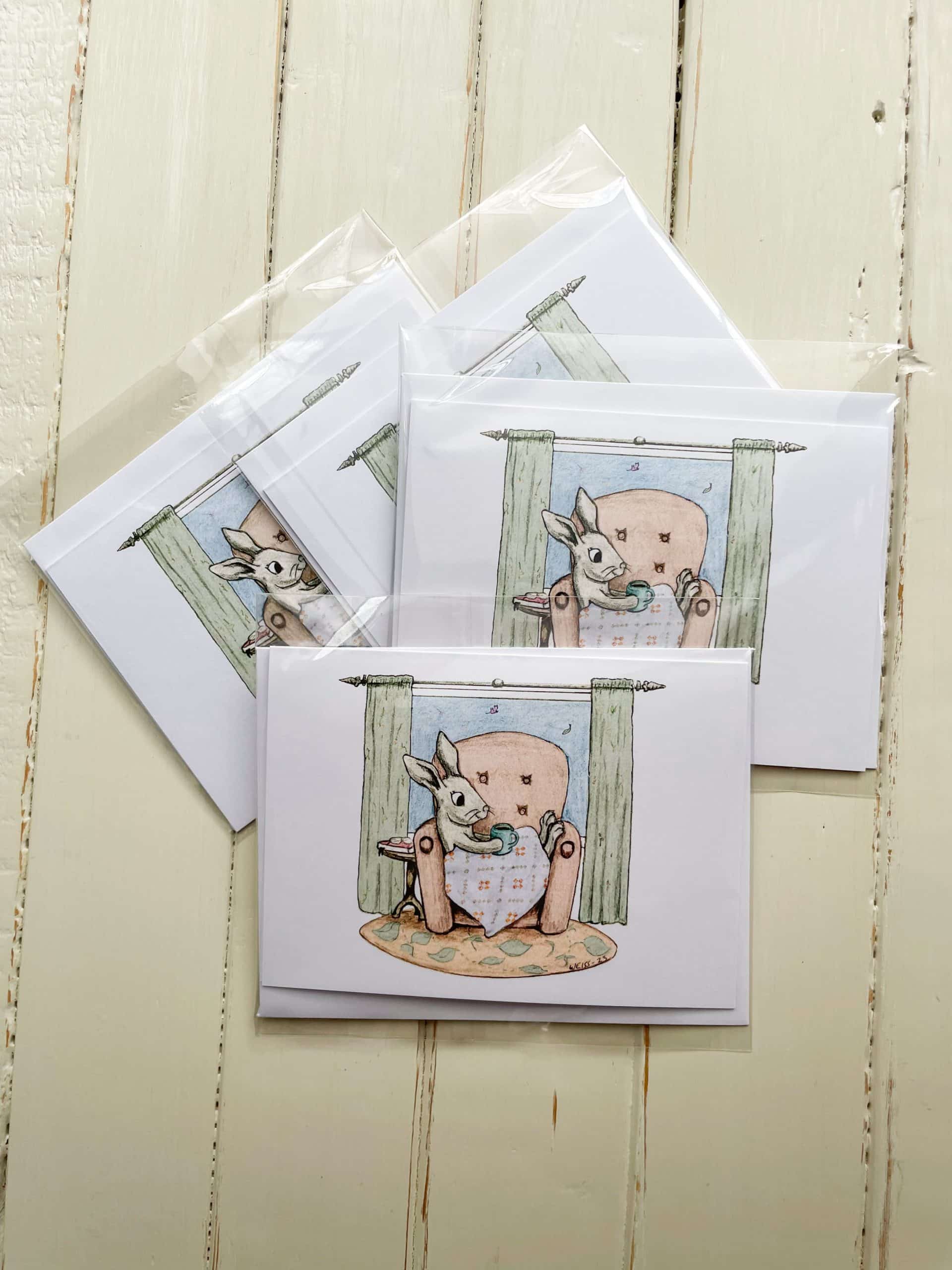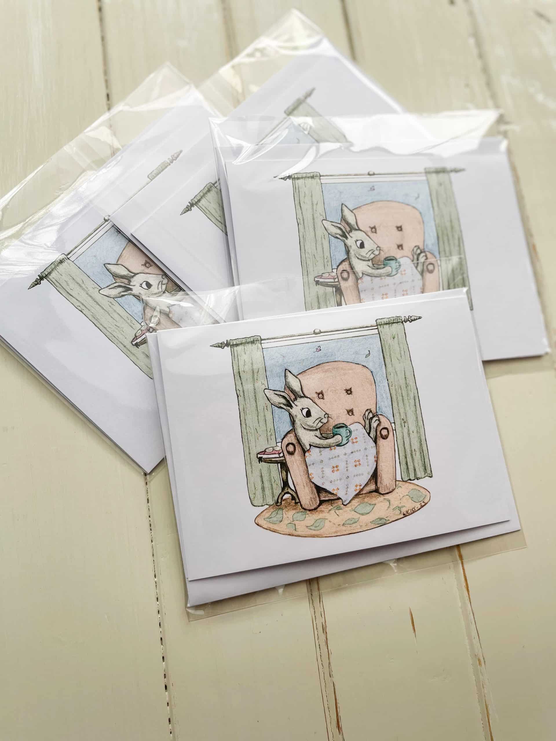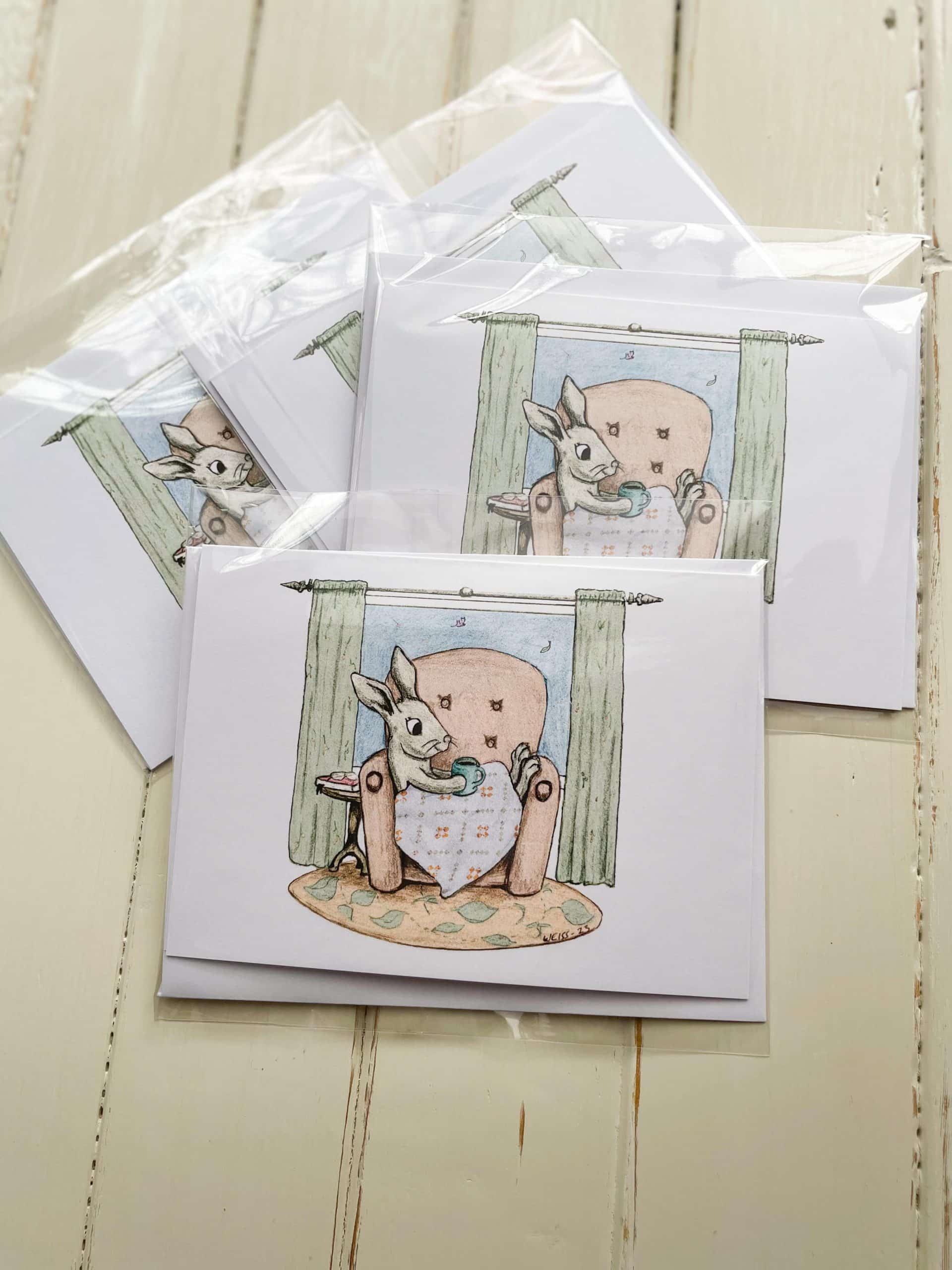 The Cozy Quilt Bunny note cards (set of 4) are an original design dreamed up by Kristin of Heart Lake Quilts and drawn by her husband Dan of Edelweiss Illustration. The quilt in the bunny’s lap is Krisitin’s design and pattern, Still Connected. They are perfect to send someone a handwritten note or give as a gift. Comes from a pet-free home.