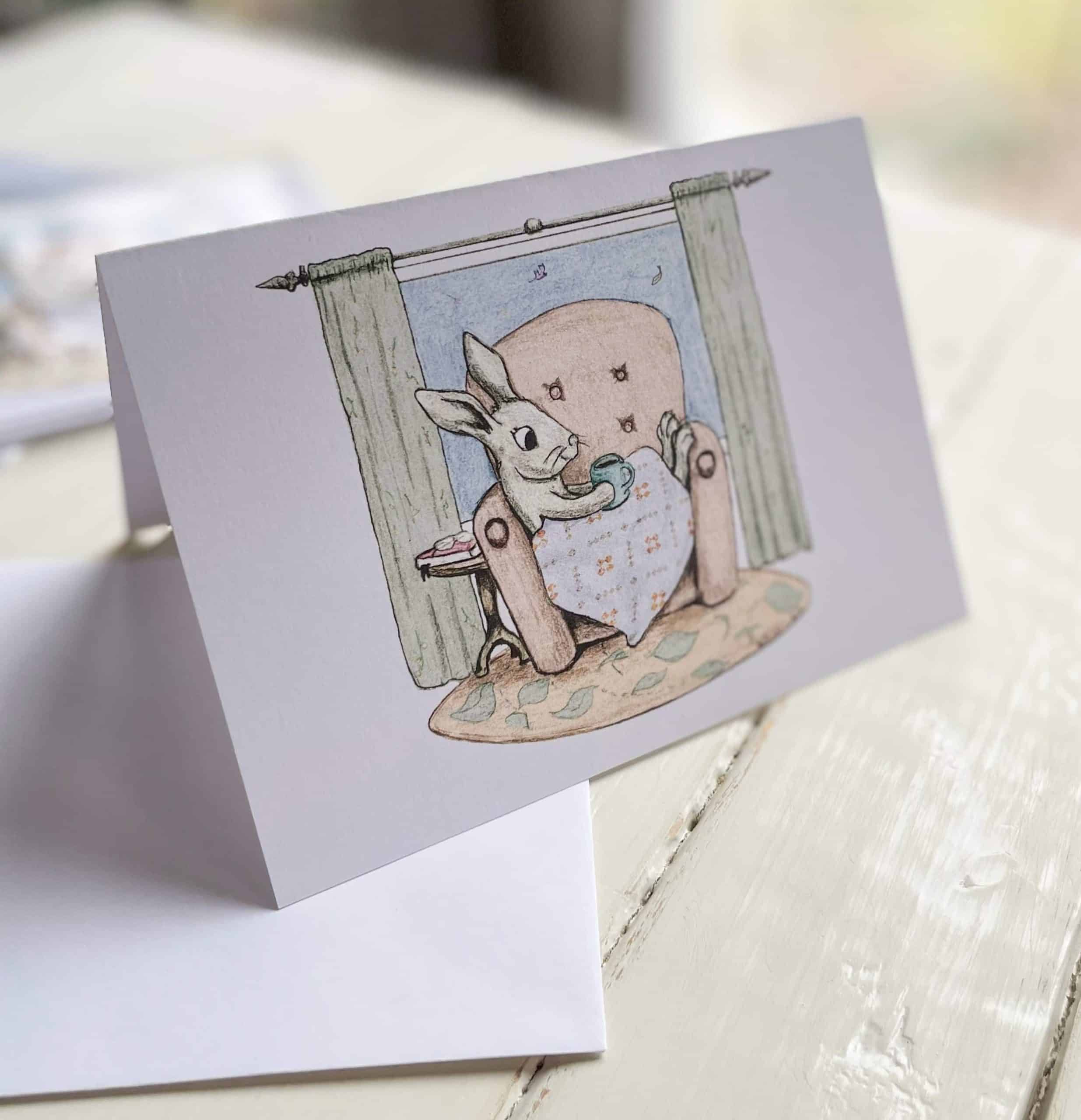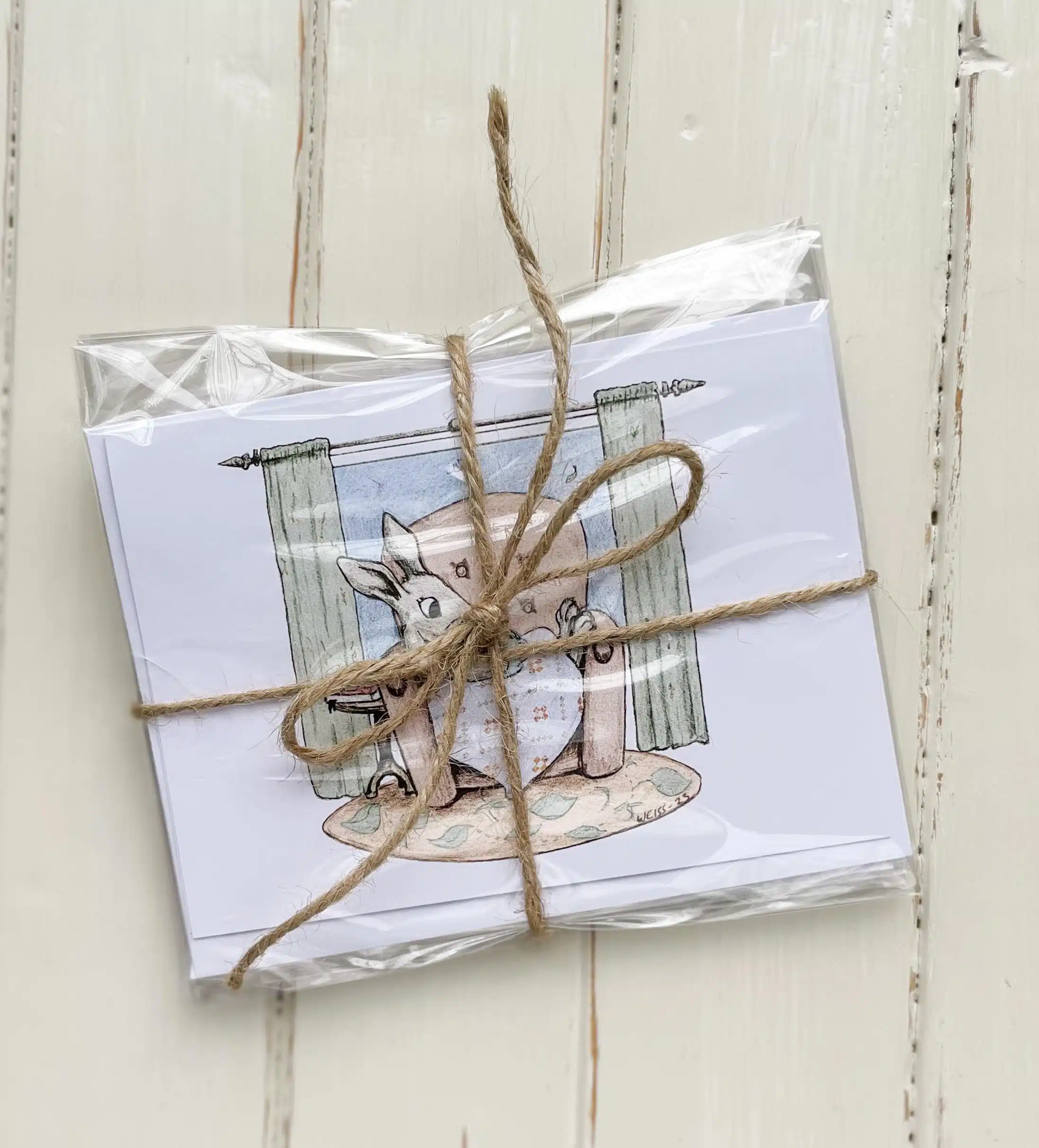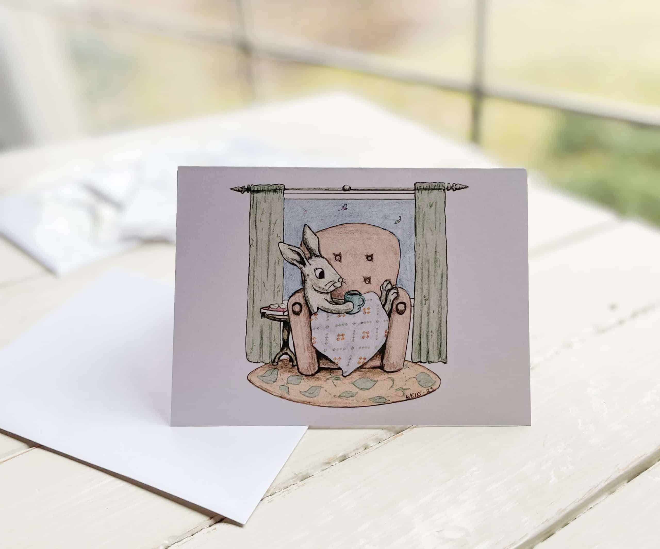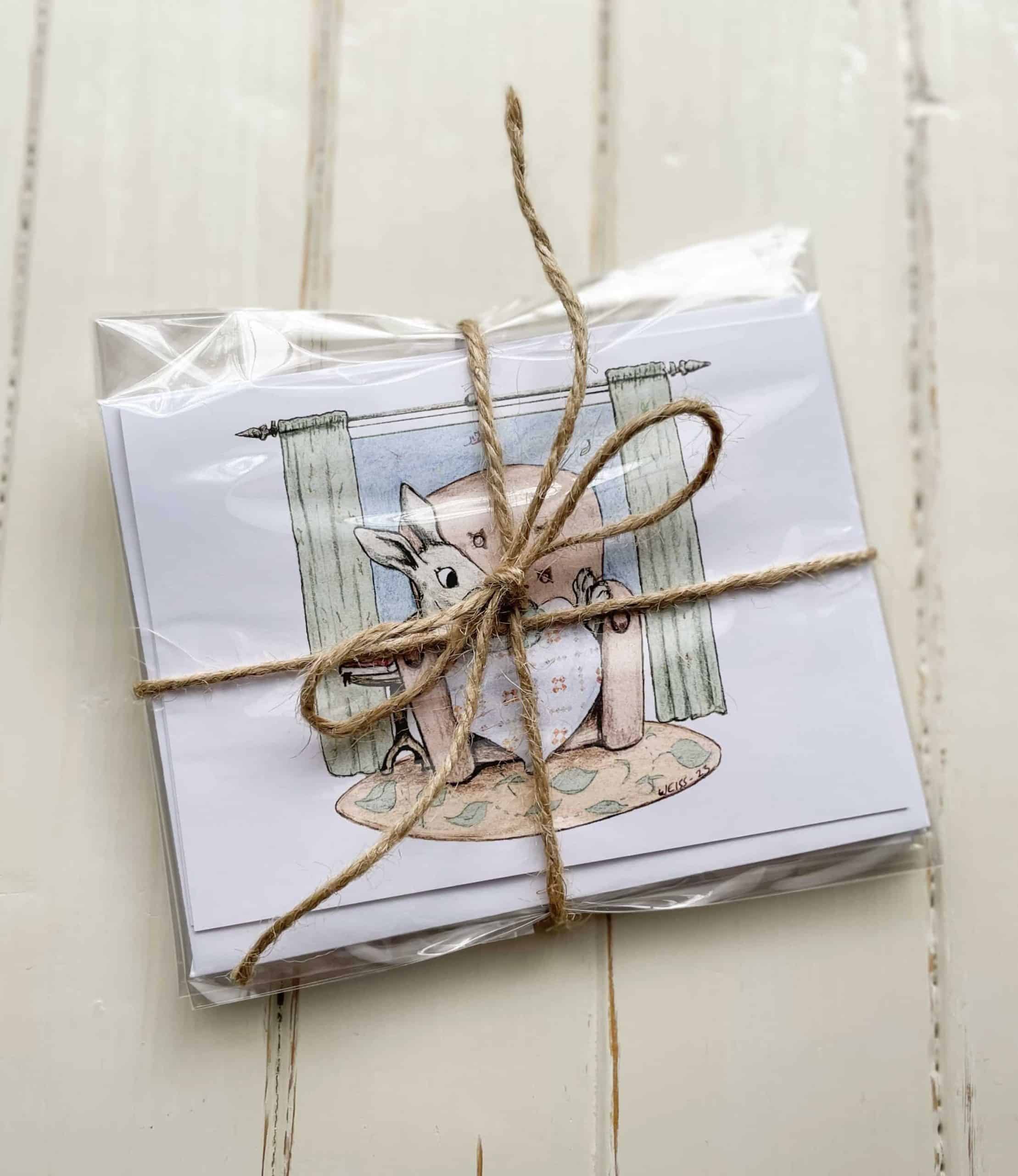 The Cozy Quilt Bunny note cards (set of 4) are an original design dreamed up by Kristin of Heart Lake Quilts and drawn by her husband Dan of Edelweiss Illustration. The quilt in the bunny’s lap is Krisitin’s design and pattern, Still Connected. They are perfect to send someone a handwritten note or give as a gift. Comes from a pet-free home.