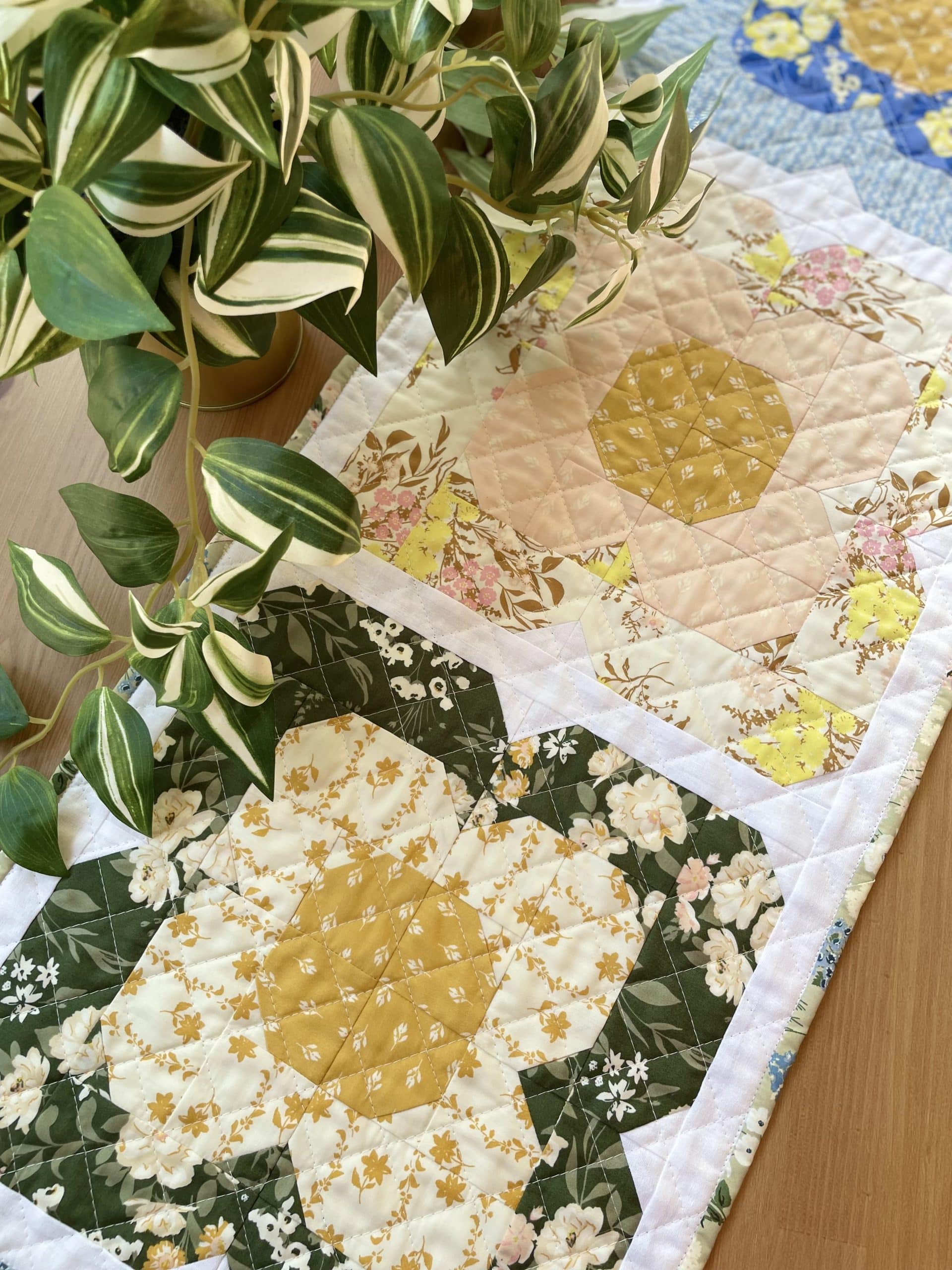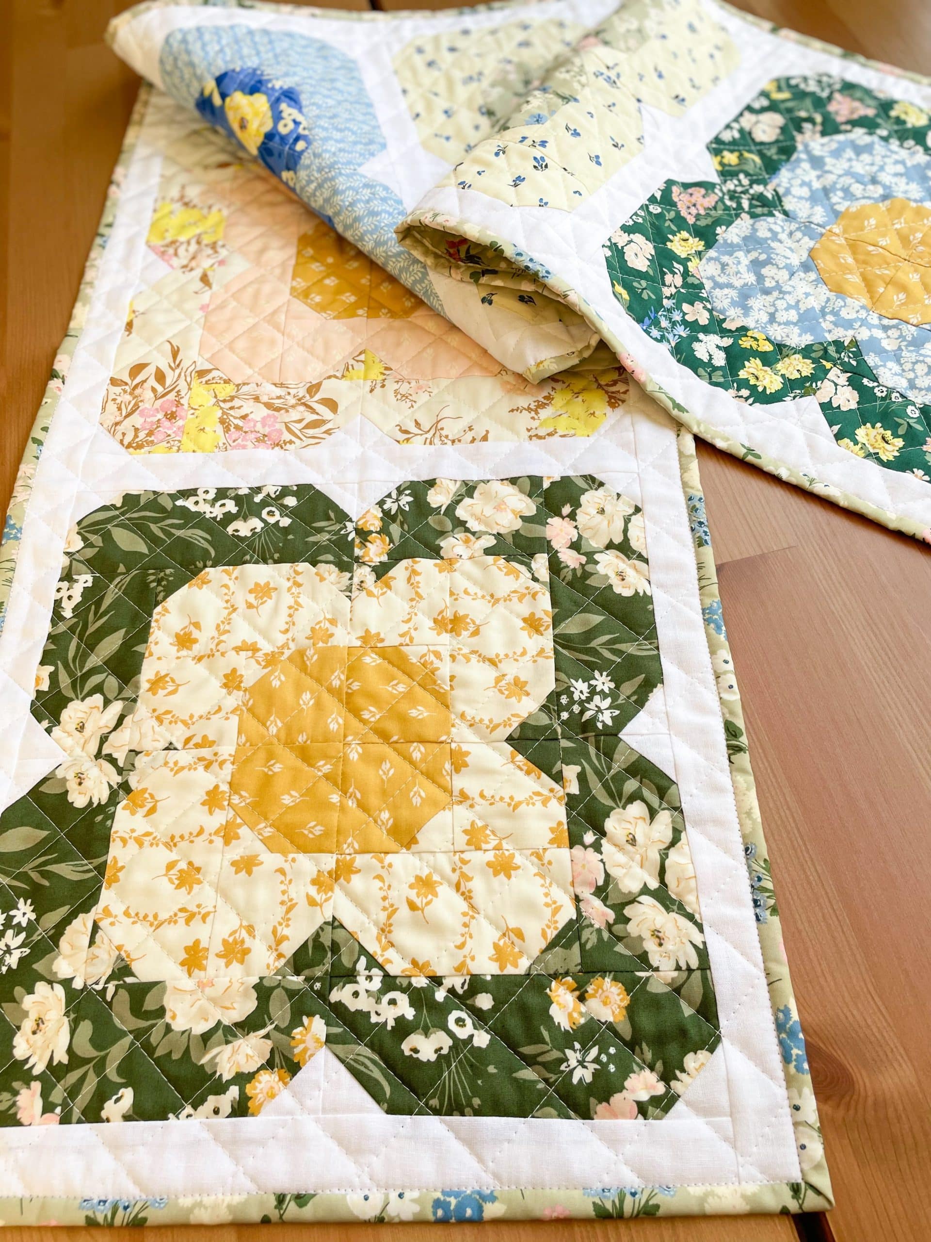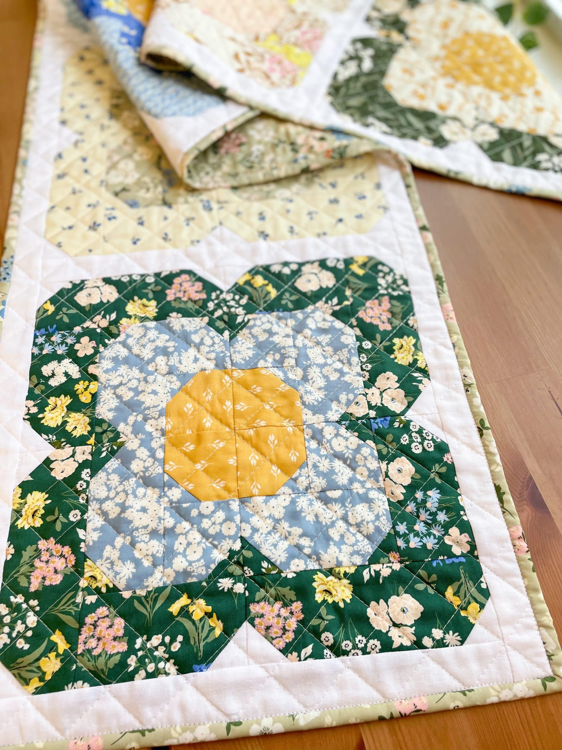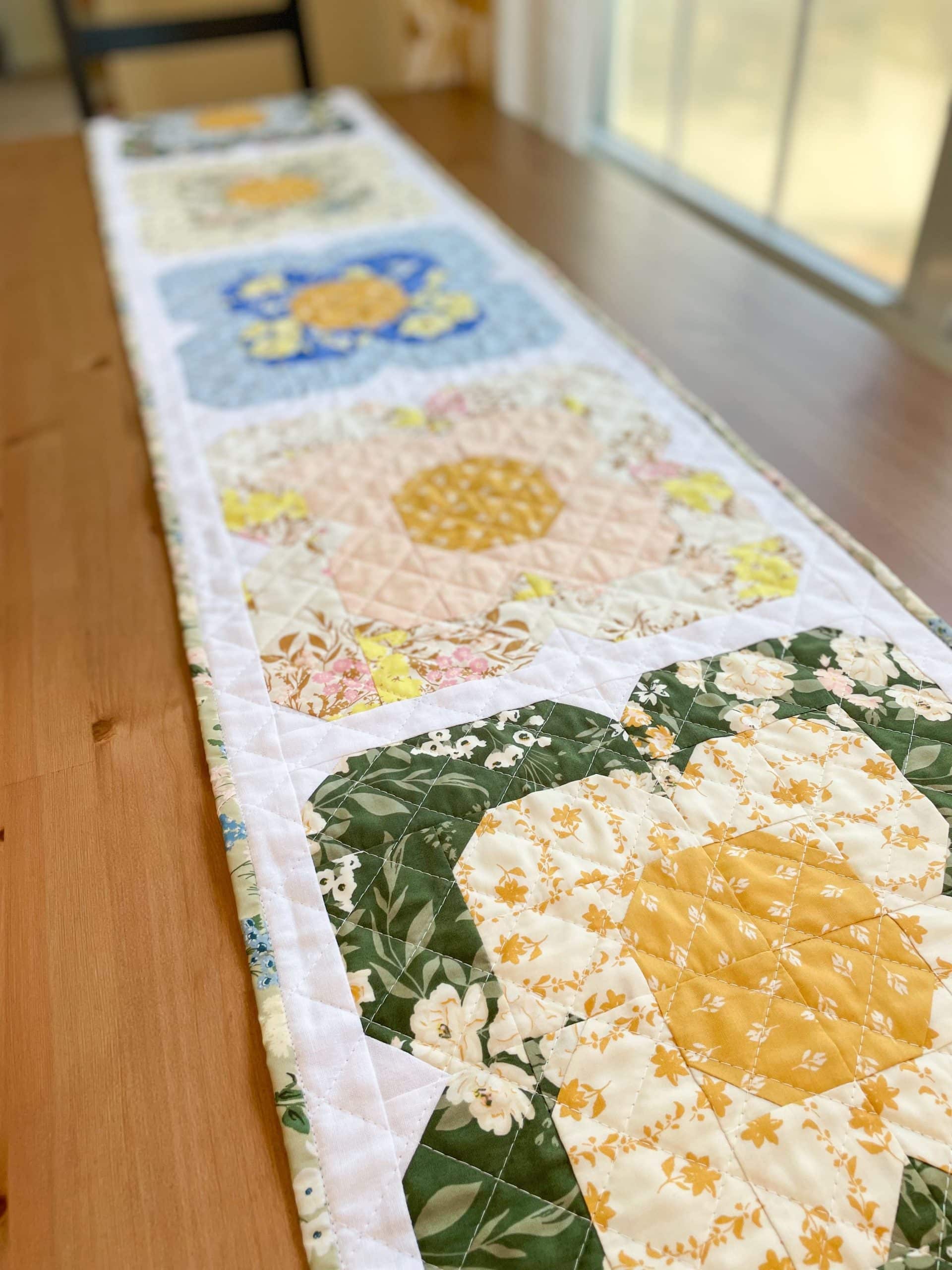 The design for this table runner came to me a few years ago during a virtual meeting for work. I saw something in the theme art for the meeting that sparked an idea. I named it after my mom who is also a quilter and has a love of flowers as well. She always has the prettiest flowers growing in the yard every spring.