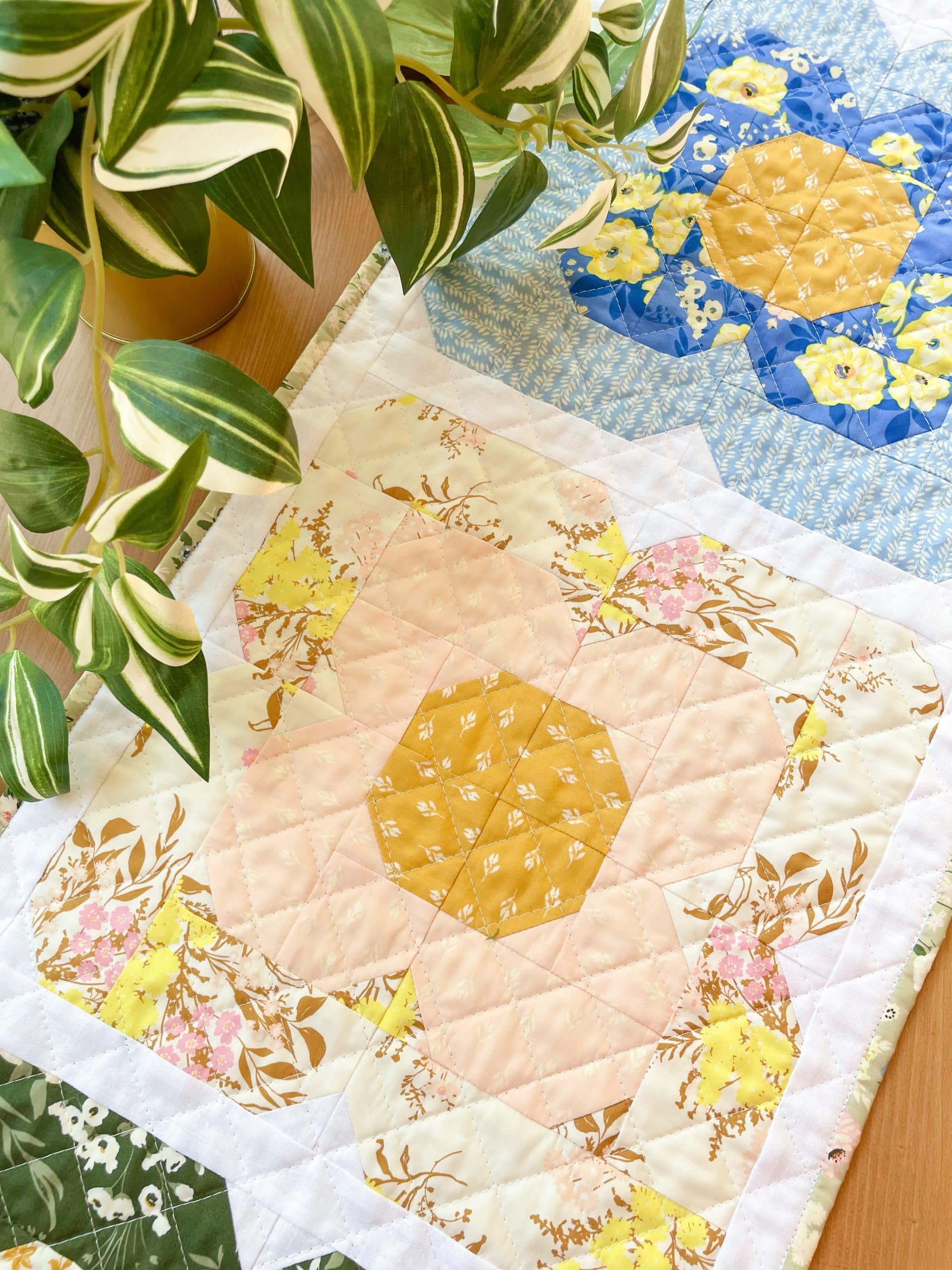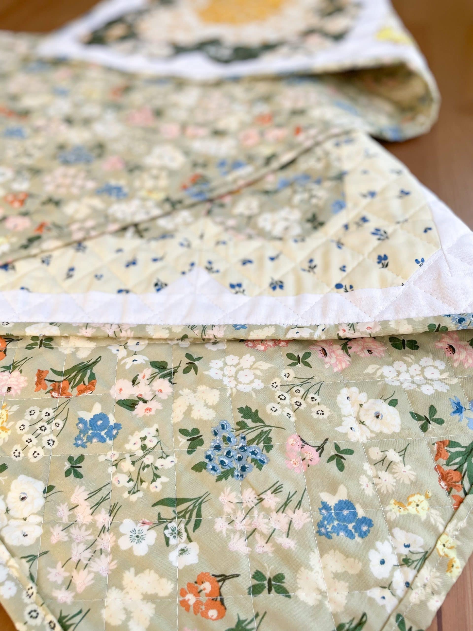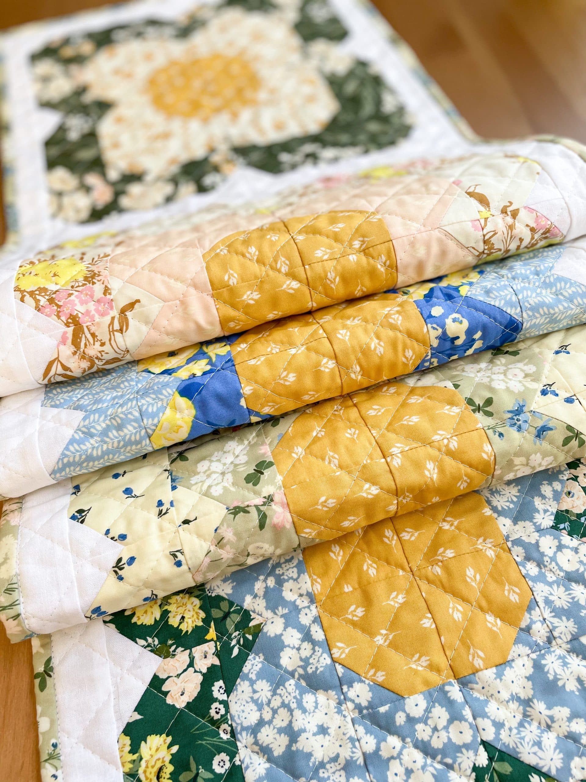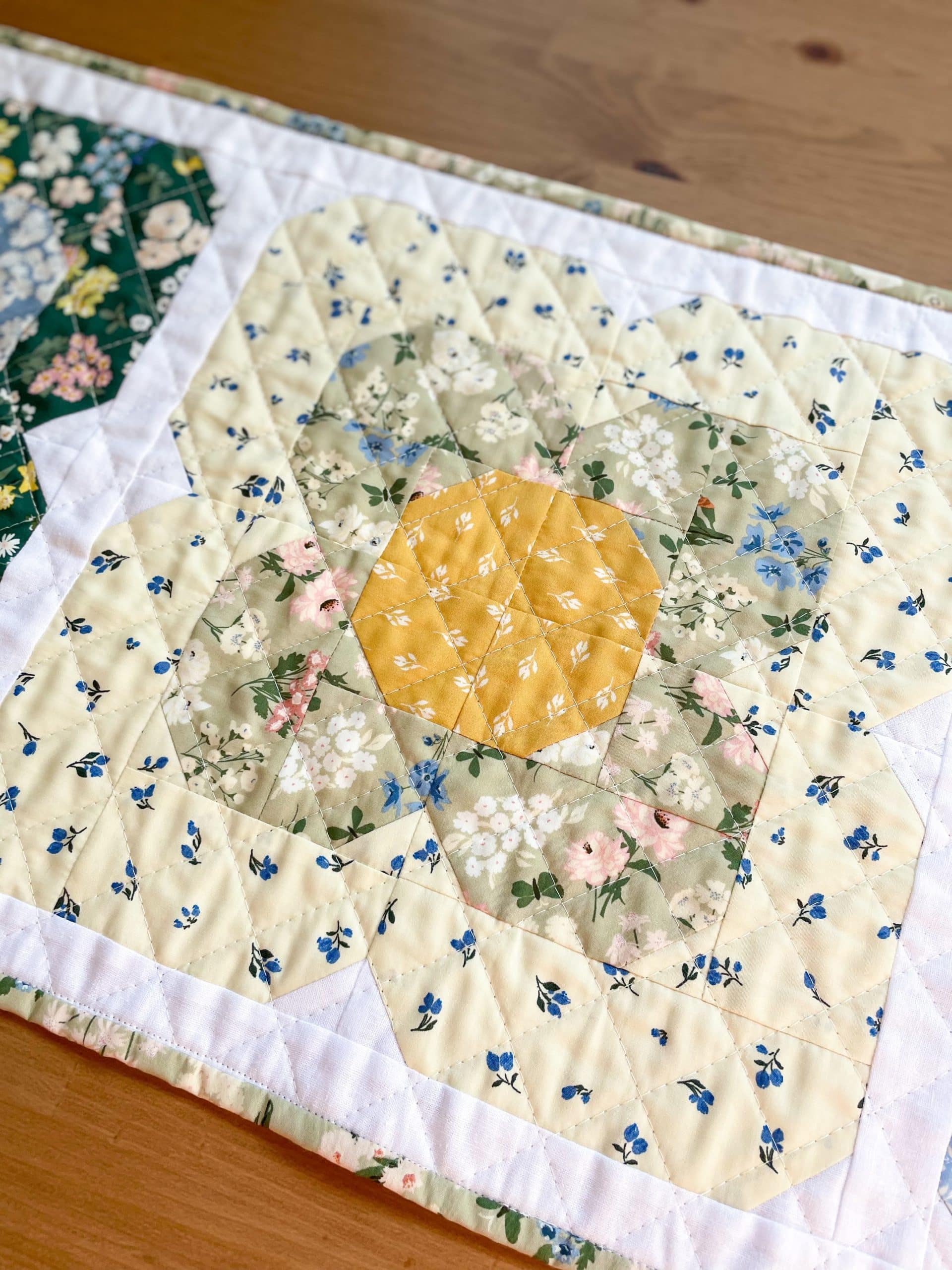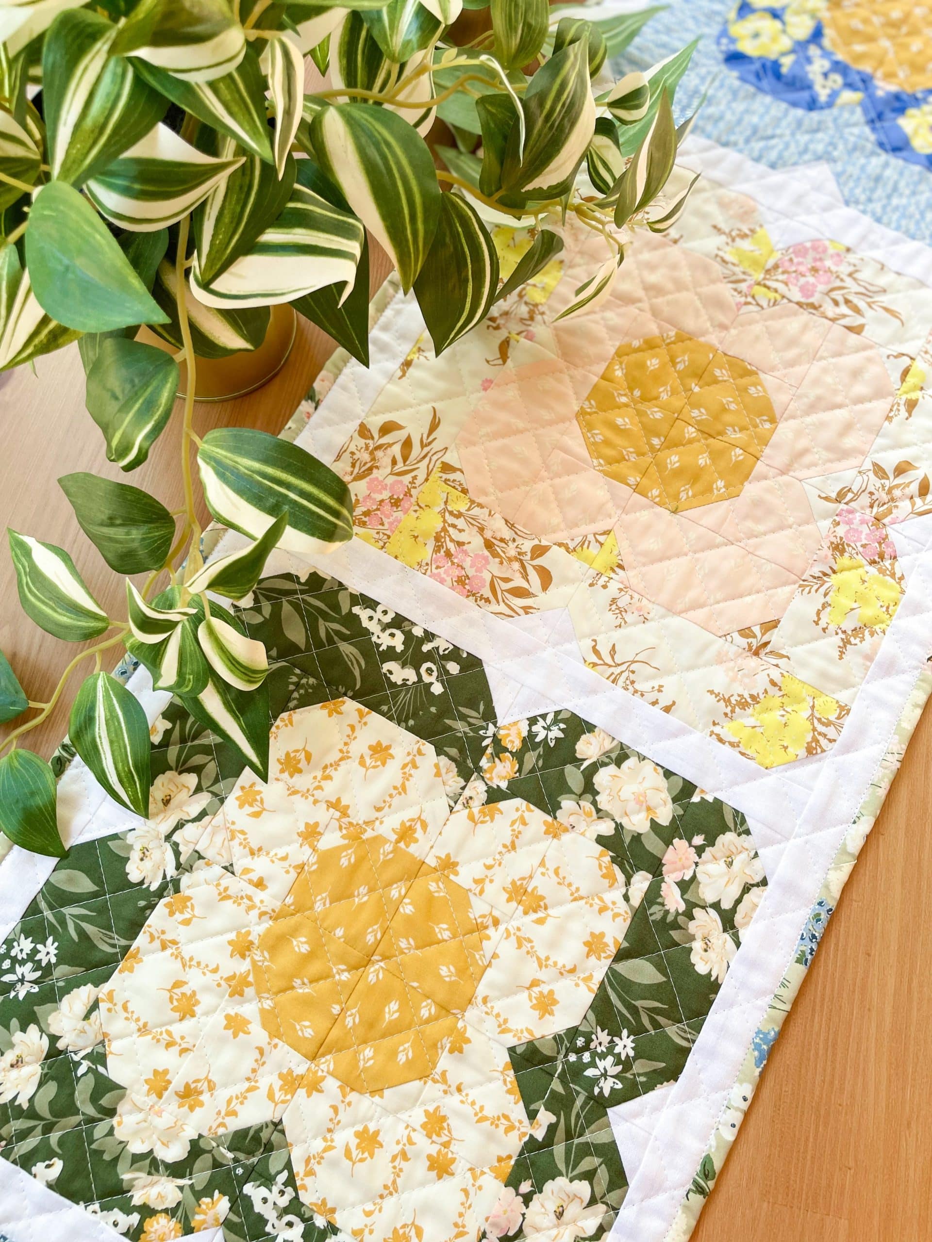 The design for this table runner came to me a few years ago during a virtual meeting for work. I saw something in the theme art for the meeting that sparked an idea. I named it after my mom who is also a quilter and has a love of flowers as well. She always has the prettiest flowers growing in the yard every spring.